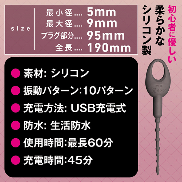 尿道シリコンプラグに電動機能を組み込んだ「パワフル極細シリコンプラグ」。 肌触りのよい柔らかな高級シリコン素材を使用し、プレイ初心者の方でも 安心してご使用いただけます。