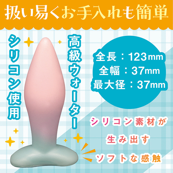 グミのようなプニプニとした触感とグラデーションカラーがとってもキュートなアナルストッパーです。弾力性があり柔らかな素材なので、アナル初心者の方でも安心してご使用いただけます! アナルプレーに興味がある方はぜひ!お菓子のグミのようなプニプニとした触感でコンパクトサイズ。アナルプレーグッズの最初の1個としても最適です。シリコン素材に細かなラメを練り込んでありコスメのようなPOPな見ためになっています。カワイイアナルプラグでお尻開拓しませんか?パッケージサイズ:H13cm×W8cm×D6cm 商品サイズ:全長:12.3cm 全幅:3.7cm 最大経:3.7cm 重量:100g