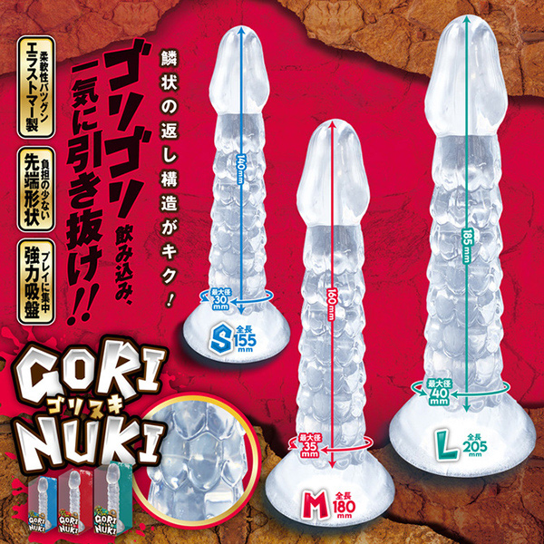 ゴリゴリ抜きすぎ注意!!鱗状の返し構造のクリスタルなディルド!1段1段ゴリゴリ飲み込み、一気に引き抜け!!プレイに集中できる強力吸盤付きで、負担の少ない先端形状。エラストマー素材なので、安心の柔軟性♪ゴリゴリ連続刺激を楽しもう!!!!●まずは気軽に試せるSサイズ♪パッケージサイズ(cm):H15.5×W5.5×D5.5本体サイズ(cm):全長15.5/横幅5.2本体重量:75g原産国:中国材質:TPE