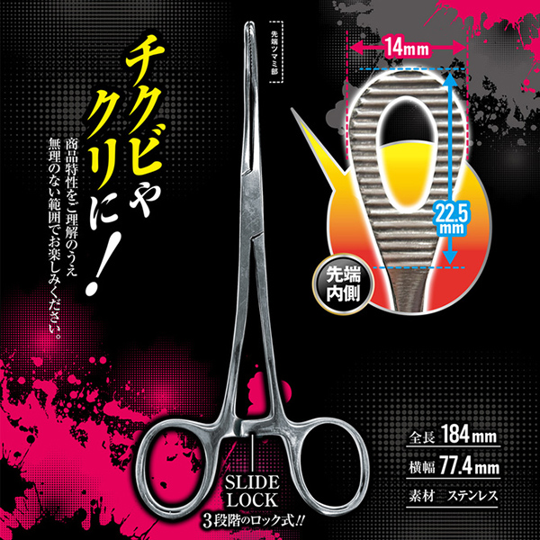 チ○ビやク○に!挟んだまんま固定できる!頑丈なステンレス製!!先端内側のギザギザ形状ががっちりと捉えて離しません。お好み位置で3段階のスライドロック!いろんな所を挟んで固定したままぶら下げたり動かしたり、穴を広げてみたり…。楽しみ方はアナタ次第。※この商品はジョークグッズです。それ以外の目的でご使用になられた場合に発生した問題等は、当社では一切責任は負いません。パッケージサイズ(cm):H21.5×W13.8×D05本体サイズ(cm):全長18.4/横幅7.7本体重量:44g原産国:中国材質:ステンレス