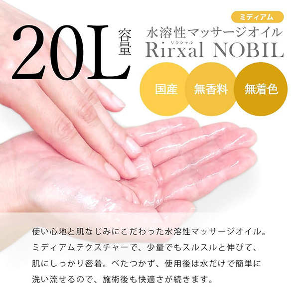 リラシャル NOBIL(ノビル)は、使い心地と肌なじみにこだわった水溶性マッサージオイル。 ミディアムテクスチャーで、少量でもスルスルと伸びて、肌にしっかり密着。 べたつかず、使用後は水だけで簡単に洗い流せます。 機能性・快適性・効率性の3つを兼ね備えた、次世代の業務用マッサージオイル。