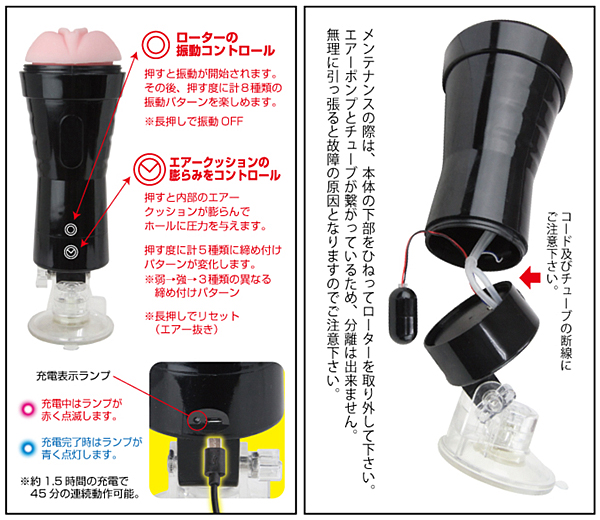 電動エアークッションによる10代の強力な締め付け感を再現した「Sex Evolution」の登場です!普通のオナホールだと、購入前に締め付け具合だとかいろいろ考えてしまいますよね?そんな心配はもういりません!なんとこちらの商品は5段階で締め付け具合を変更できるようになっています!まったり系が好きな人も、キツキツ締め付け系が好きな人もしっかりとお楽しみ頂けます。挿入直後は縦と横で一気に攻めるヒダヒダと、亀頭を刺激するイボイボ地帯がとっても快感です!そして最深部の大きなコリコリ刺激があなたのストロークを一気に加速させます。極めつけは超強力吸盤と角度調整可能に加えて、PCデスク等にもしっかり固定可能な機能があなたのプレイの幅を無限大に広げてくれます。全てにおいてあなた好みに調整可能なSex Levolutionをぜひお楽しみください!