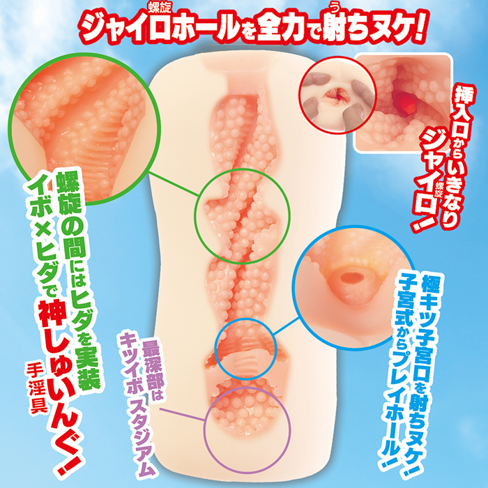 まったりとした螺旋型の内部が長く楽しめる! ジャイロボールのように螺旋型の軌道を模した内部構造を持つオナホール!全長170センチ、756gという大型ホールとなっているので、ずっしりとした存在感を感じることができます。内部は螺旋型の突起にツブツブが無数に配置されており、螺旋の間にはヒダが施されていて、ツブ×ヒダ×螺旋のワイルドな刺激を味わえます。螺旋を越えた奥にはキツキツの子宮口が待ち構え、亀頭をキュポっと咥え込みこみ、ツブツブが配置された子宮部屋へと誘われます。非貫通タイプなので竿に吸着するようなバキュームを感じることができ、やがて射精へと導かれます。オナホールの素材はまったりと柔らかい感触となっているので刺激的には長時間楽しむことができます。腰が浮くぐらい絡みつくような螺旋を味わいください!