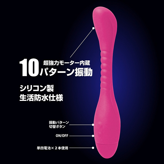 フレキシブルヘッドが快感ポイントを直撃! 鞭のようにフレキシブルに曲がって、Gスポットをハイパワー振動で刺激するバイブレーター【コブラ】!スリムなボディのシリコン素材で挿入しやすく、ぷっくりと膨らんだ先端がGスポットを的確に捉えて振動を伝え、コブラのように真ん中部分が蛇腹になっているので、ピストンする度に挿入口をゴリゴリと擦り上げ、絶頂へと導きます。振動パターンは10種類と多彩で飽きることなく長く楽しむことができちゃいます。生活防水機能搭載でお手入れも簡単にでき、場所を選ばずにプレイできます。