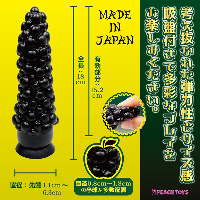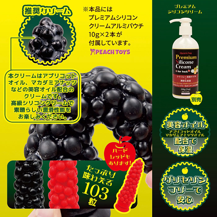 ゴツゴツとした突起がアナル内部を刺激する一風変わったディルドをお探しの方は注目!ブドウのような大小様々な大きさの房が103粒付いたディルドが登場しました!プニプニと弾力のある柔らかなボコボコ形状で入口や膣壁をコリコリと擦りながら刺激します。アプリコットオイル、マカダミアナッツなど美容オイル配合のプレミアムシリコンクリーム付きで、お肌に優しくスルスルと挿入できる潤滑性能を誇り、グリセリンフリーなので安心安全です。底には吸盤がついているので、床や壁に固定してフリーハンドでお使い頂けます。本体サイズ:18.0×Φ1.1-Φ6.3cmパッケージサイズ:23.5×15.0×6.5cm重量:250g