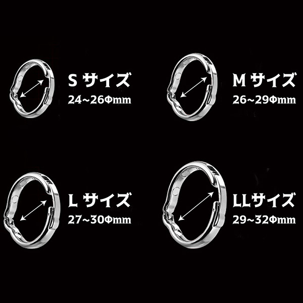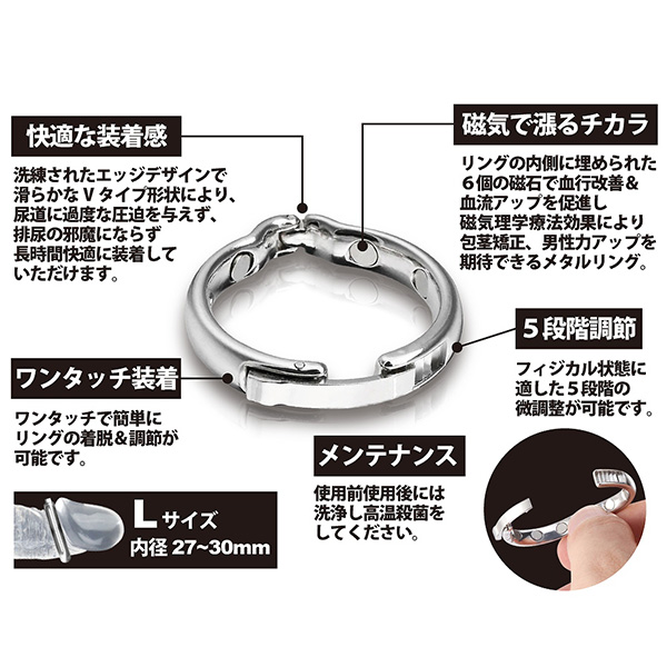磁気パワーで男の自信と野性を呼び覚ます! リングの内側に埋め込まれた6個の磁石によって磁気が発生し、血流が良くなって勃起力の増進や持続力のアップ、包茎矯正ができます!また洗練されたエッジデザインで尿道に当たる部分は少し窪みのあるVタイプの形状となっており、過度に圧迫せず排泄の妨げにならないので長時間快適に装着頂けます。さらに5段階の調整ができ、勃起時と通常時でサイズ調整が可能となっています。装着する際もワンタッチで着脱ができ手軽にお使い頂けます。金属製なので使い終わった後は、煮沸消毒ができ衛生面でも高いクオリティとなっています!磁気の力で男性自身がビキビキになること間違いなしです!