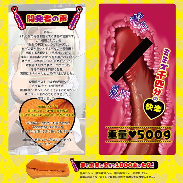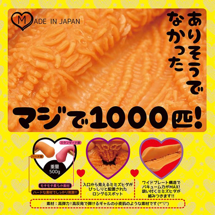 マジでミミズ1000匹!?比喩ではない本物の快感をここに実現!!びっしりとひしめき合う肉壁のヒダがグニュグニュと絡んで刺激する極上の挿入感♪高反発で弾けるギャルの小麦肌を再現した、高刺激のハードタイプ。本体サイズ:18.0×Φ8.6cm重量:500gパッケージサイズ:21.3×17.3×11.2cm