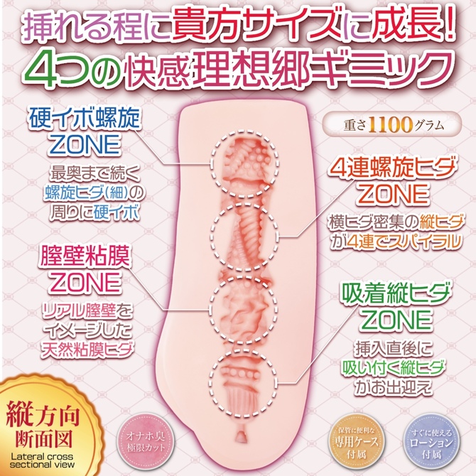 「もっと、何度でも、抱いてください」Shangri-La Girl 1100は「「使用する程に貴方サイズに成長」するオナホです。横方向に湾曲したS字状のホールが挿入毎に慣らされ、徐々に形状変化。貴方にジャストフィットする理想のオナホに成長していきます。 ボディは「末永く何度でも愛していただけるパートナー」を開発テーマとし、ハンドホール最大級ボリューム「全長20cm 重量1.1kg」の大型ボディを採用。豊満な肉厚ボディの中心に「敢えてひとつのみ」のホールを大胆に配置しました。 これにより包み込むような抱擁力、吸い付くバキューム感、そして強固な耐久力を実現。 据え置きでの腰振りプレイでもお楽しみいただけるハイブリットオナホとなっています。 内部構造は「吸着縦ヒダ・ち●壁粘膜・4連螺旋ヒダ・硬イボ螺旋」と4つの快感ギミックを網羅。 前半はソフトでまったり系。後半はハードな強刺激系となっている為、緩急あるプレイをお楽しみいただけます。 やわらかく微香な「やわはだ素材」で乙女の柔肌を堪能しながら「貴方サイズの理想のオナホ」を育ててください。 長期保管に便利な専用ブリスターケース、オリジナルローション付属。 イラスト:218(にーや)