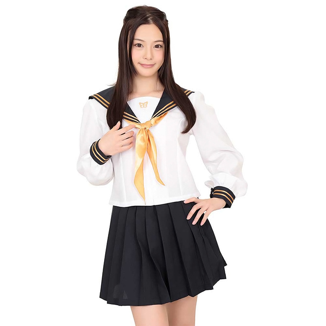 ちょっと珍しいゴールドライン&リボンのセーラー服。胸元には蝶刺繍でデザイン性をプラス。高級感のある程よいバランス感で定番でも新しい!##セーラー上着、プリーツスカート、スカーフMサイズ(B78-88、W58-70、H87-95)