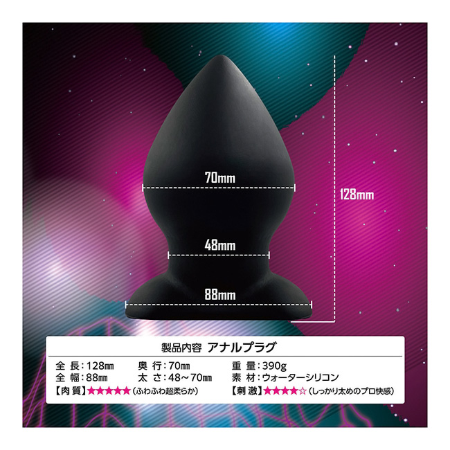 シリコンを超える進化素材、超しっとりで凄なめらか、快感度を追求したマテリアル、それがこのウォーターシリコン素材なのです。しっとりきめ細やかな質感に、生々しい生体的な肉感弾力、人体や環境にも優しい安心材料。ぐっぽり挿入るしっかり太いプロご用達モデル!挿入感を高める流線的なフォルムに、極上の肉々しさをプラスした、プレミアムなアナルプラグに仕上がりました。本体:12.8×8.8×7cm重量:390gパッケージ:14×9.2×8.5cm