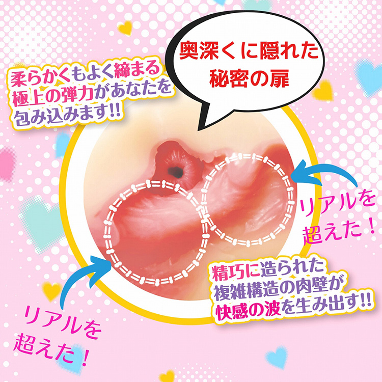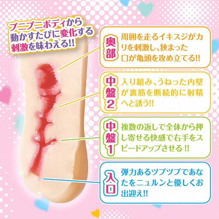 箱入り娘の、プニプニボディを動かすたびに変化や刺激が味わえるオナホ。1:弾力のあるオナホの入り口があなたを、ニュルンと優しくお出迎えします。2:複数のヒダとバキュームポイントで、ピストンをはずみをつけて激しく動かしたくなります。3:入り組んで、うねった内壁が裏筋を断続的に攻め続けます。4:最深部は、イボイボとヒダが、左右からあなたを攻めてきます。本体サイズ:17.0×8.5×8.5cm重量:700gタイプ:非貫通付属品:ローション
