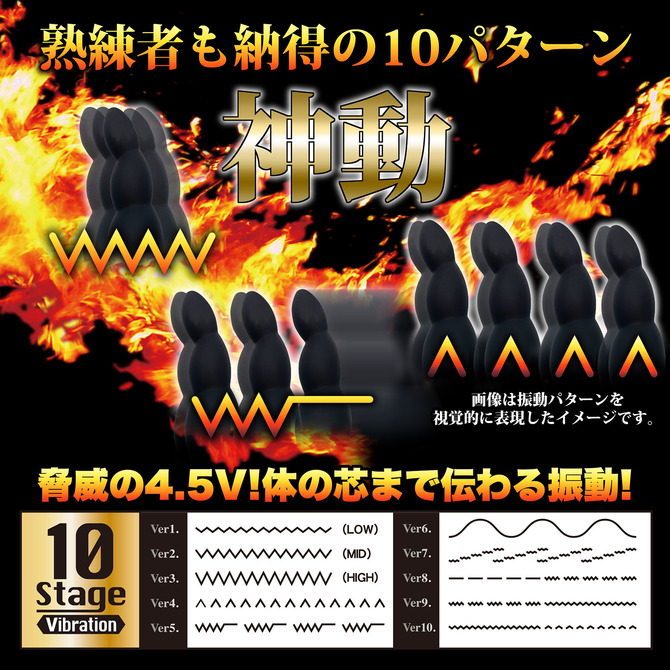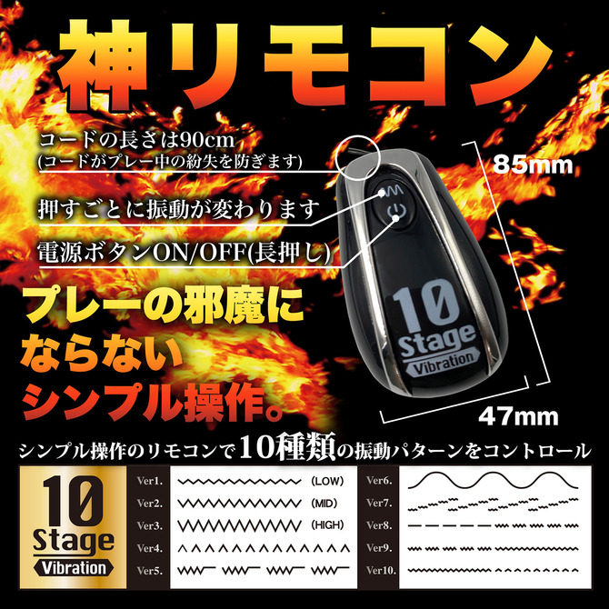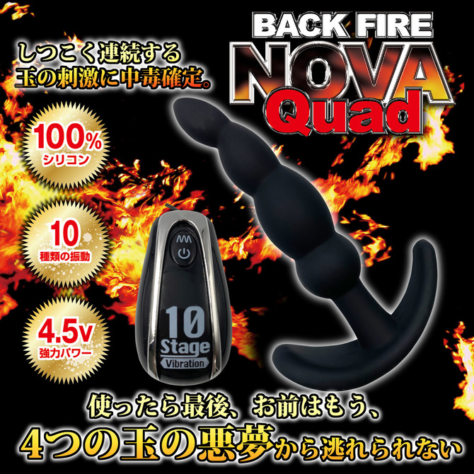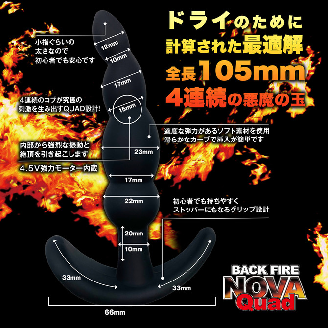 クワッドは、座薬の位の大きさ(1センチ)の先端から始まり、1.6センチ、2.2センチ、2.1センチと全部で4連続の隆起が続く設計になっています。内部に密着し、緩やかなカーブが、前立線やGスポットなどをダイレクトに刺激します。奥まで入れると、入り口付近で強烈な振動と快感を引き起こすスタイルになっています。強力なバイブの振動パターンは10種類、コード付きのリモコンで紛失を防げます。パッケージサイズ:19×14.5×3.5cm本体サイズ:11×7×2.3cm付属品:単四電池×3