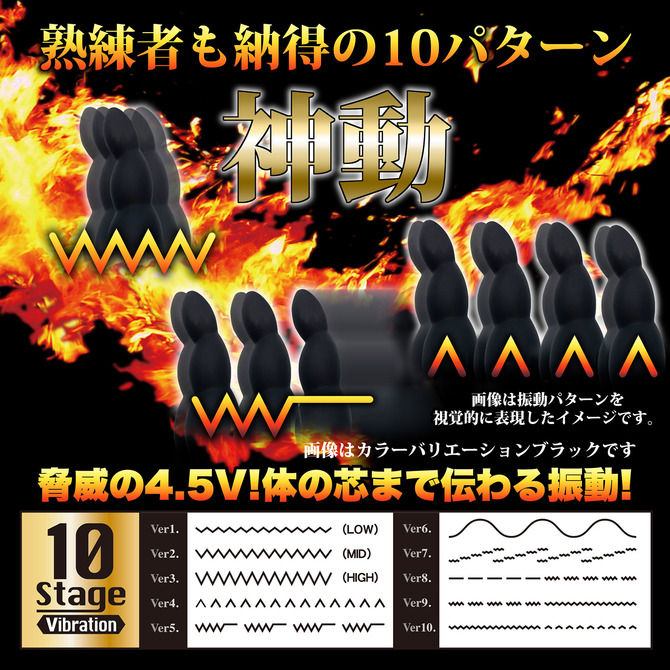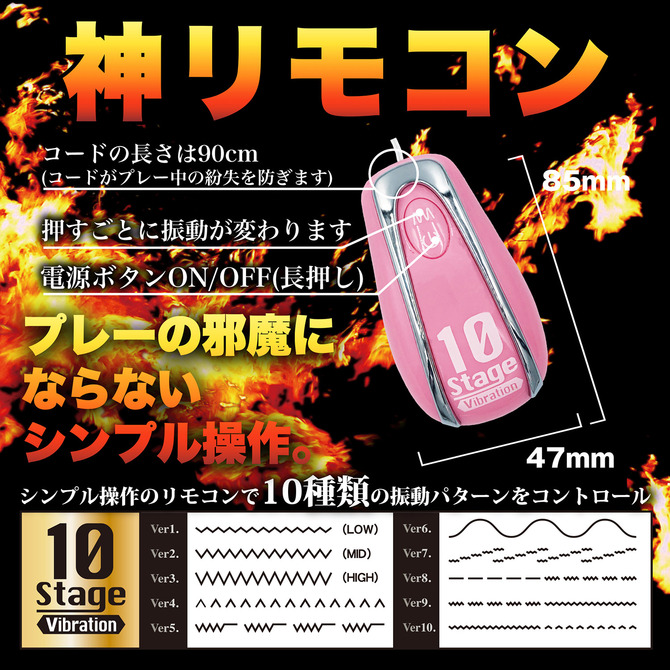 奥まで入れると、入り口付近で強烈な振動と快感を引き起こすスタイルになっています。強力なバイブの振動パターンは10種類、コード付きのリモコンで紛失を防げます。