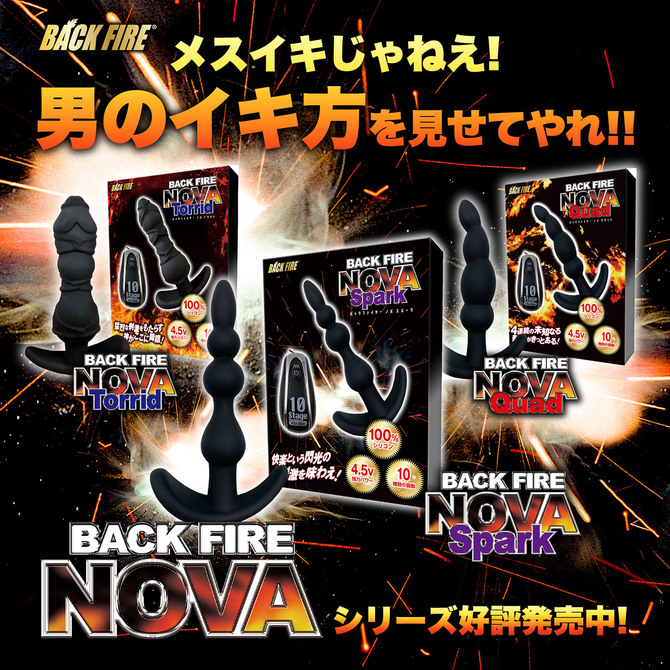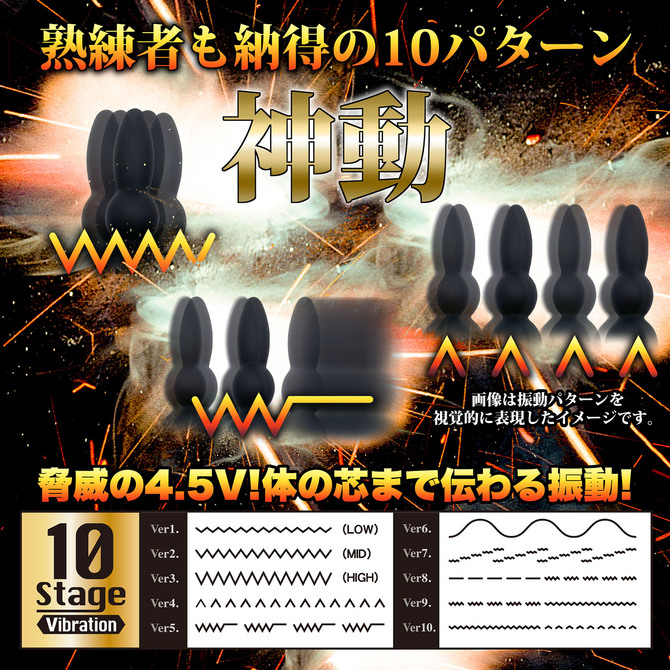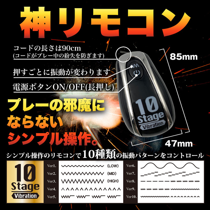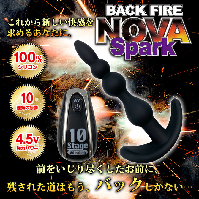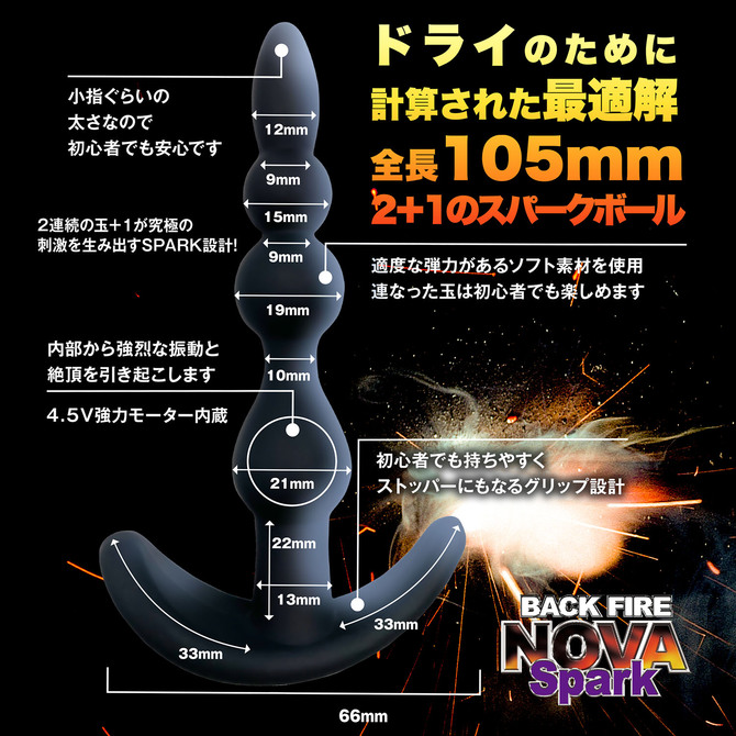 スパークは、座薬の位の大きさ(1センチ)の先端から始まり、2連続の15mm&19mmの玉が続き、最後は内部にローターを搭載した21mmの玉が待ちかまえています。全部で4箇所の隆起を体験する設計になっています。1個の玉を通過するたびに、ゾクゾク感と振動が強くなっていき、最後の玉を飲み込んだ時には、まさに脳内でスパーク現象が引き起こされることでしょう!。強力なバイブの振動パターンは10種類、コード付きのリモコンで紛失を防げます。パッケージサイズ:19×14.5×3.5cm本体サイズ:11×7×2.3cm付属品:単四電池×3