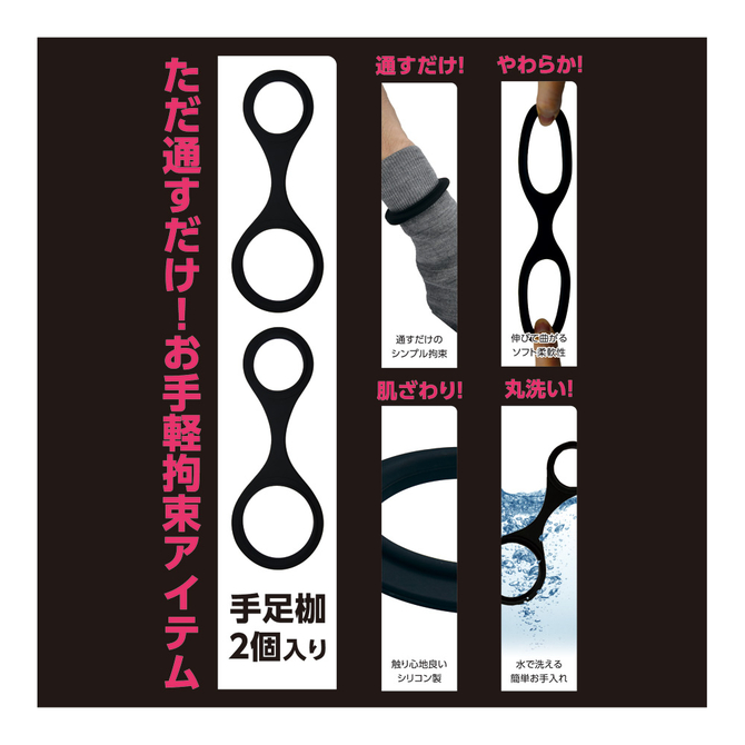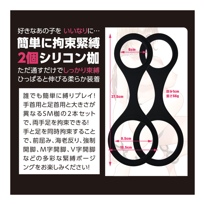 好きなあの子をいいなりに……。 ただ手や足を通すだけでしっかりSMプレイになる、超シンプルな拘束具「SMシリコン手足枷」! SMプレイの核心となる「拘束」を、とってもお手軽にするSMアイテムです。 輪っかの中に、手や足をただ通すだけ。 難しいことが一切無いシリコン枷です。 本体のシリコン素材には柔軟性がありますので、装着感もバツグン。 大きさは、男性でも装着可能なフリーサイズ。 丸洗いもできてメンテナンスも簡単。 見た目シンプルなのでタブー感が薄く、ソフトなSMプレイにぴったりです。 「手足枷」は、片方は手枷、もう片方は足枷となる、 ハーフ&ハーフモデルが2個付いたセットです。 両方の手首と足首を繋げて拘束することができます。手と足を拘束することで、前屈み、海老反り、強制開脚、M字開脚、V字開脚、などなど多彩な緊縛ポージングを演出いただけます。