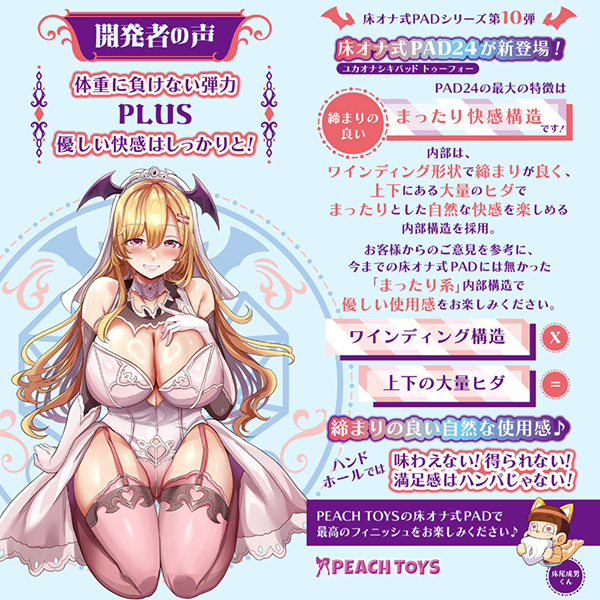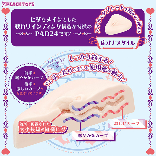 体重に負けない弾力 PLUS 優しい快感はしっかりと!床オナ式PADシリーズ第10弾「床オナ式PAD24(ユカオナシキパッドトゥーフォー)」が新登場!PAD24の最大の特徴は、締まりの良い「まったり快感構造」です!内部は、ワインディング形状で締まりが良く、上下にある大量のヒダでまったりとした自然な快感を楽しめる内部構造を採用。本体サイズ:H23.5×W22.5×D6.5cm 内部長:13.5cmパッケージサイズ:H30.0×W34.0×D9.0cm【日本製/非貫通/ローション付】